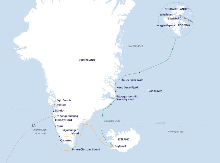Combining a deep exploration of Svalbard with Greenland’s remote east coast, Arctic Complete offers an unforgettable Arctic adventure. From Reykjavik, we cross the Greenland Sea to discover the world’s largest national park, and the world’s largest fjord system at Scoresbysund. High above the Arctic Circle, discover Svalbard’s glaciers and abandoned settlements before heading north into the pack ice in search of polar bears and walrus.